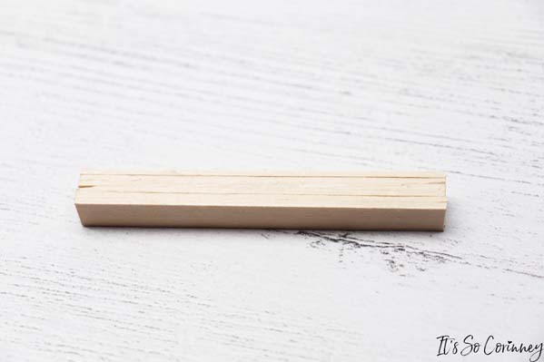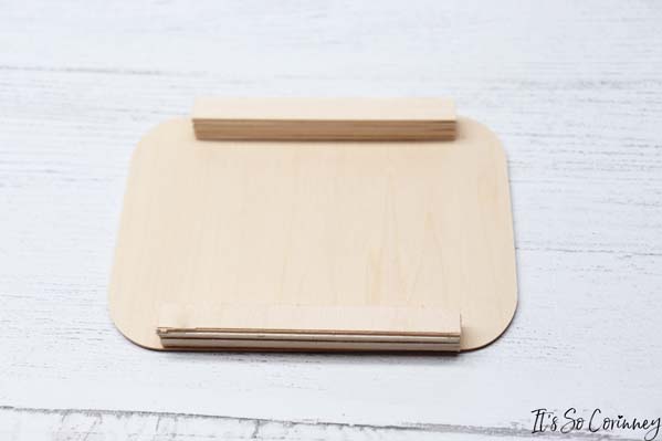 Now, this is a totally optional step as you could easily leave your candy bar holder natural. However, if you want to jazz up your candy bar holder you could totally use acrylic paint once it’s assembled. Obviously, I did not do this! Next, glue the bottom of the two wood stacks and press onto the center of the bottom piece. Let sit for a while before adding the candy bar!