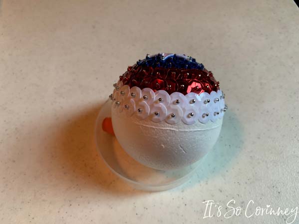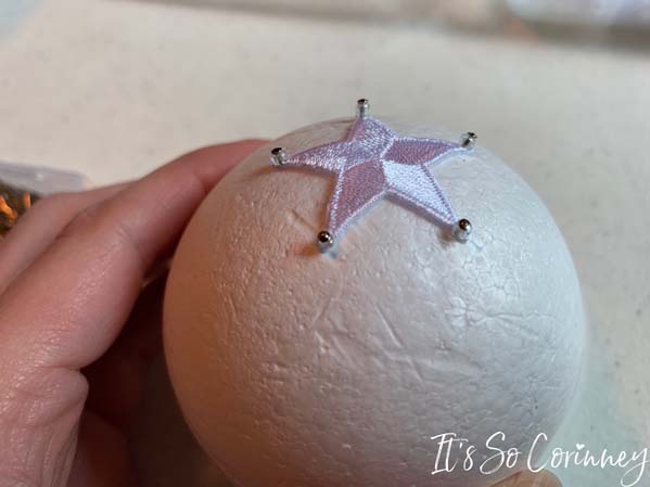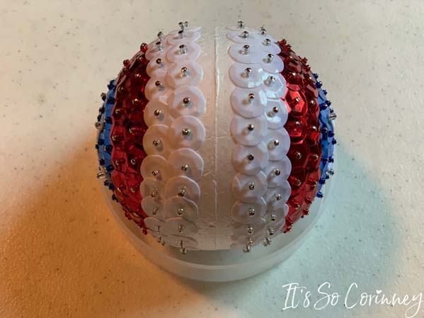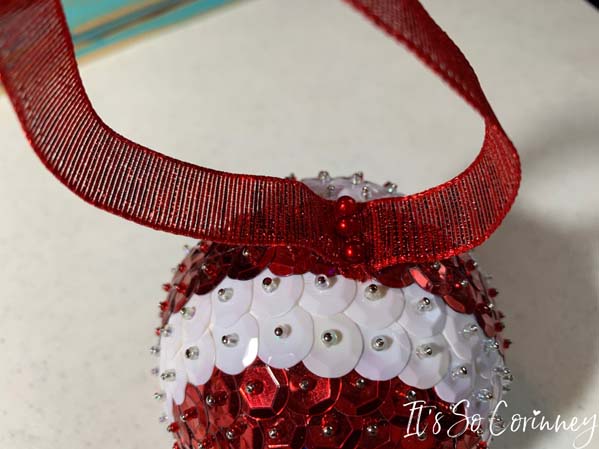 Tip! You might need to remove pins that are holding the sequins down under where you want to add the ribbon. Then the decorative pins will go flush into the foam ball.