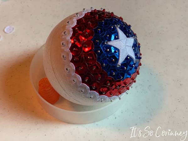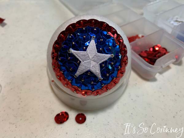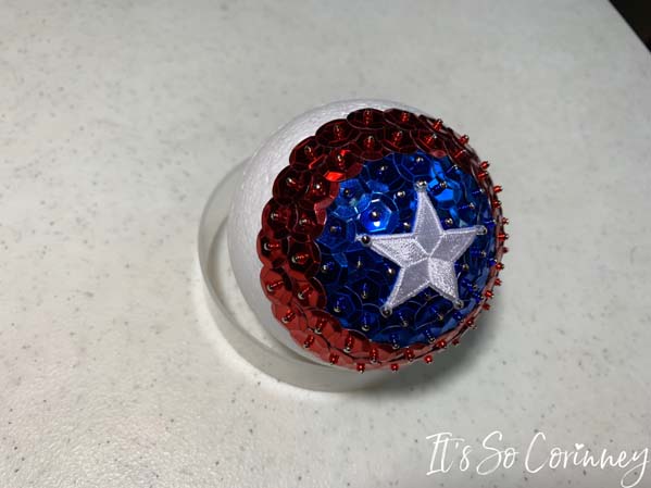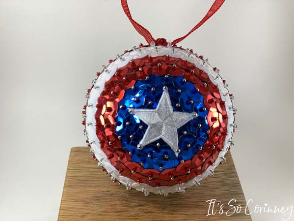 The Captain is truly my favorite Avenger because his motivation is never selfish and is always for the good of everyone. My sister is also a HUGE Captain America fan! So, I thought wouldn’t it be a marvel (pun intended) if I could design a Captain America sequin Christmas ornament. Once I had finished the ornament I seriously giggled because I thought it was so cute!