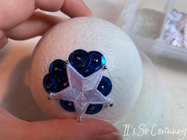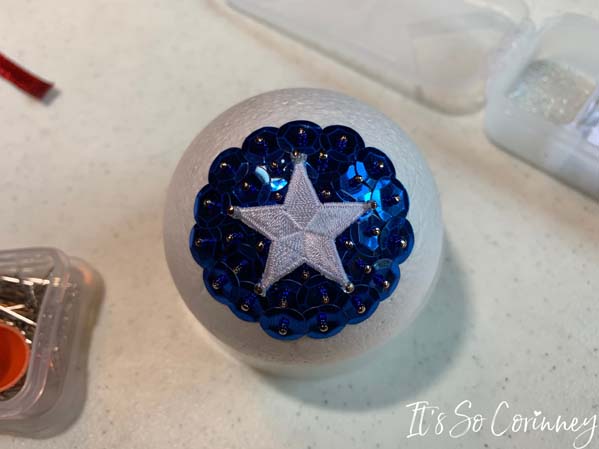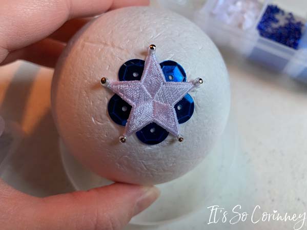 Make a row of blue sequins and make sure that no white of the foam ball is showing even if you have to shimmy the blue sequins under the pins of the star points. Once finished with this row of sequins you can firmly push down the pins in the star.