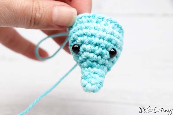 - Insert eyes between rounds 7 & 8 on either side of the trunk with 5 stitches between them