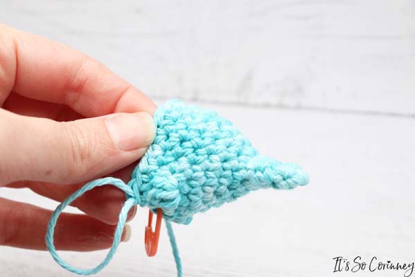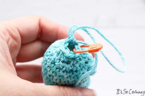 - Fasten off and leave a long tail to sew hole closed by inserting yarn needle under each of the remaining 6 stitches and pulling tight to close