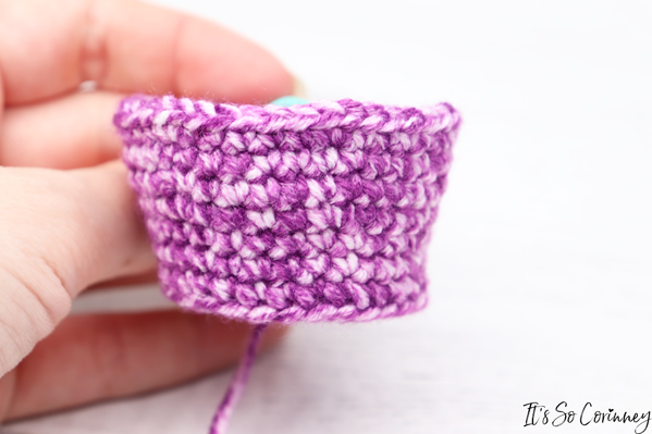 - Next, we are going to sew the soil to the pot. Roll the rim of the pot down so it’s out of your way. Then insert your yarn needle into the first back loop stitch from round 13.