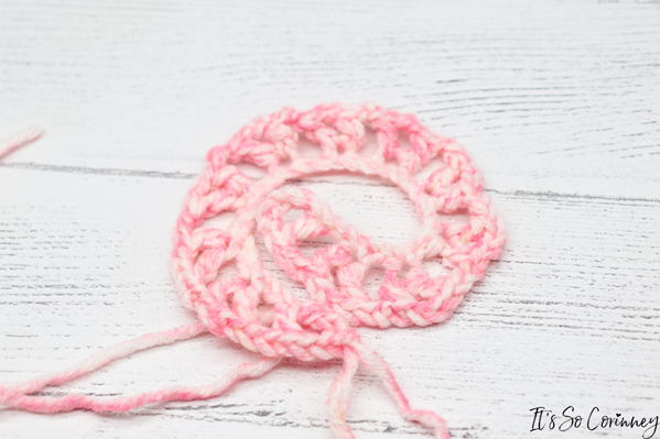 - *Chain 2, skip next 2 chains, in next chain double crochet, chain 2, double crochet* repeat to the end (12 V clusters)