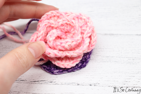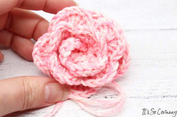 - Use the long yarn tail and sew through the rose a couple of times so it stays together