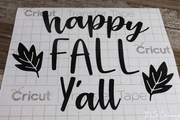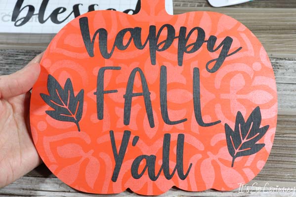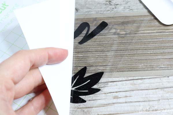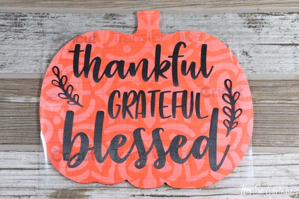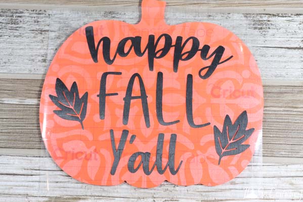 Now, align the first saying on one side of the pumpkin sign. When you are happy with the placement smooth the vinyl onto the pumpkin.
