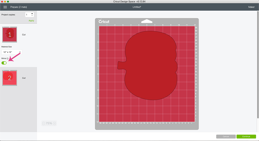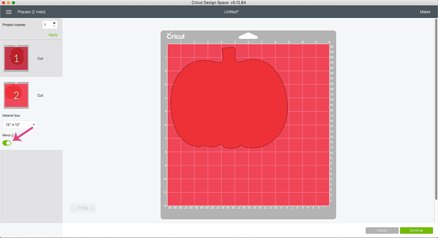 Once you have the wood secured to the mat it’s time to cut! Since you are cutting wood there are some extra steps that need to be taken. The first step is to move all of the white star rollers on the bar in the Cricut all the way to the right. Then when you go to cut the pumpkin you need to click on the Mirror button in Cricut Design Space (see pink arrow). This makes sure that the Cricut is cutting on the back side of your design so if there are any chips while cutting it won’t ruin your project.