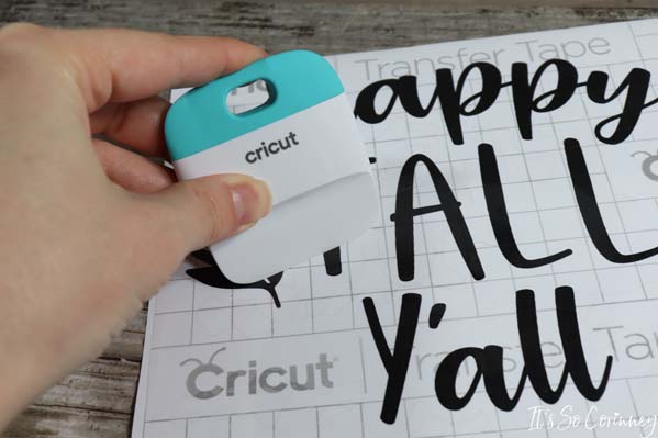 Next, press the transfer tape onto the vinyl. I use my Cricut scraper to do the job!
