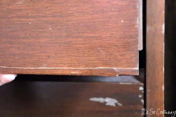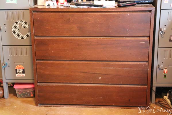 Have you ever shopped for a new dresser? I have and I was SHOCKED how expensive one can be! And if you want a solid wood dresser you might as well kiss a pretty penny good bye. So, I was totally bummed after looking everywhere for a decent priced dresser. Then…..my mom found a solid wood dresser at a thrift store for only $20! As exciting as the price was there was a catch. The dresser needed some MAJOR love. Someone had taken off the legs (so sad), some of the drawers were cracking, and the finish was horrible.