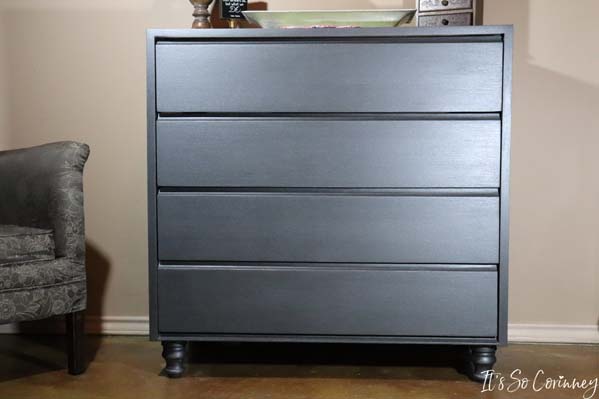 So, since I love redoing furniture I instantly started looking up finishes for my new/old dresser. When I saw several dressers in metallic paint online I KNEW that my dresser wanted to be fancy like that! So, I did a ton of research on paint brands and finally settled on the Modern Masters Metallic paint. Check out my full review of the paint in my Is Modern Masters Metallic Paint Right For You’re Project post!