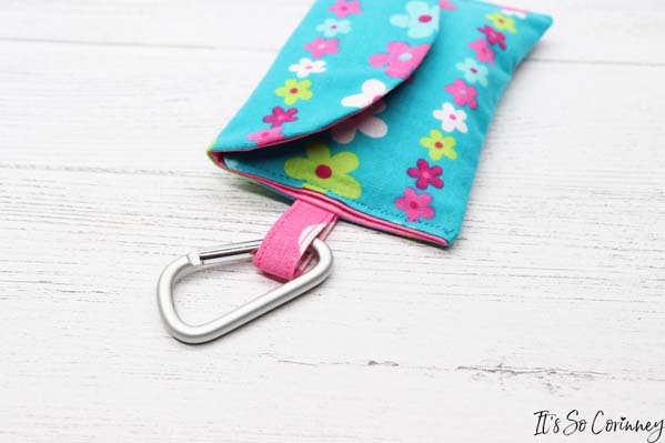 Next, add a mini carabiner hook so you can easily clip the dog treat pouch to your pant loop or bag!