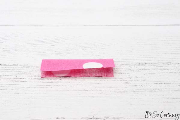 Then fold the tab in half and press. Next, measure 4 1/4 inches from the bottom of the dog treat pouch and pin the tab to the outside piece. You can add the tab to either the right or left side of the pouch.
