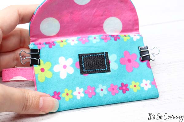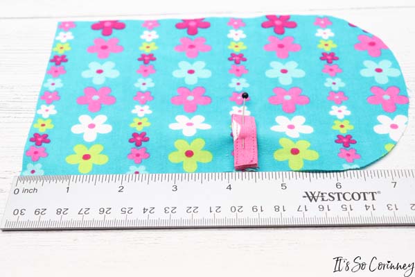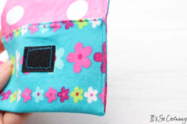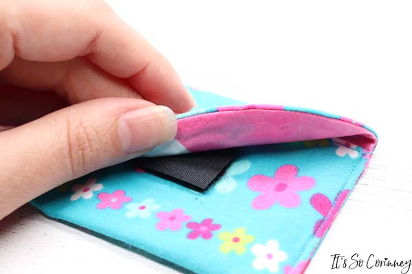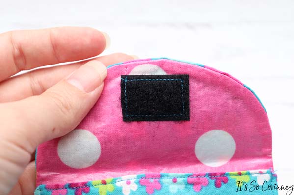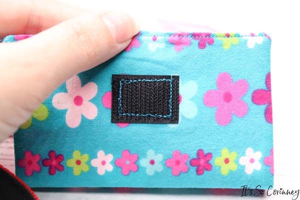 Next, cut a 1 inch piece of Velcro and pin one side of it 3/4 inches down from the top edge in the center of the pouch. Then sew around the Velcro.