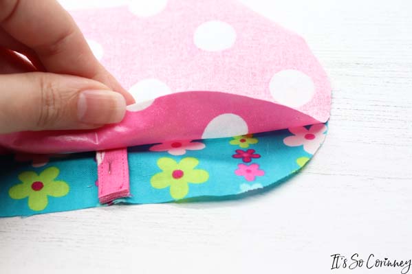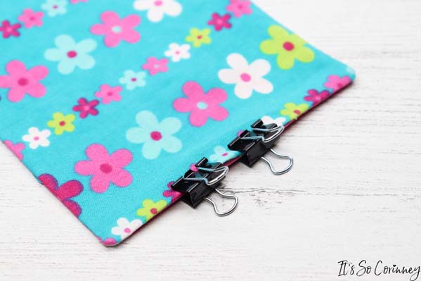 Next, press the pouch (not on the vinyl side) and turn under the turning hole. Pin or clip the turning hole closed.