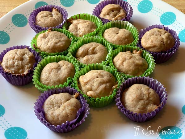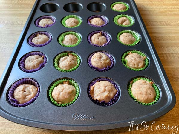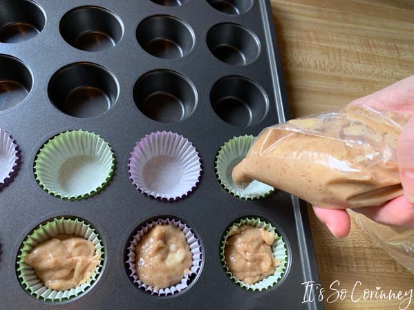 Take your batter and put into a freezer bag. Zip the bag then cut off one of the end corners. Now you can easily pipe the mixture into the mini cupcake pan. I like to use cup cake liners in my Wilton mini cupcake pan. Cupcake liners make clean up SO much easier!