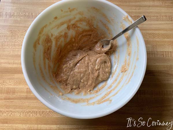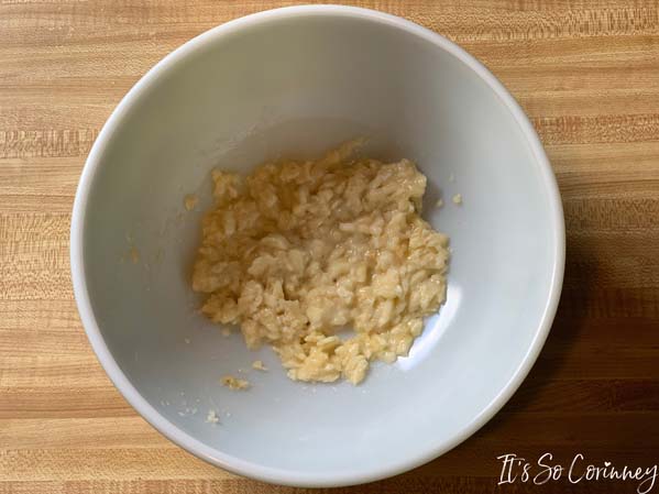 In a large bowl mash up the medium banana. Mash it until it looks like baby food.