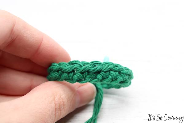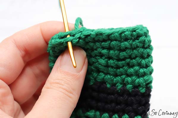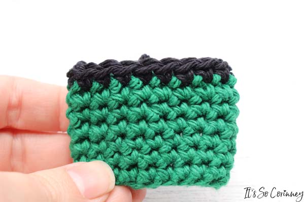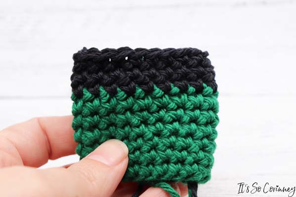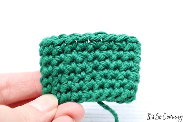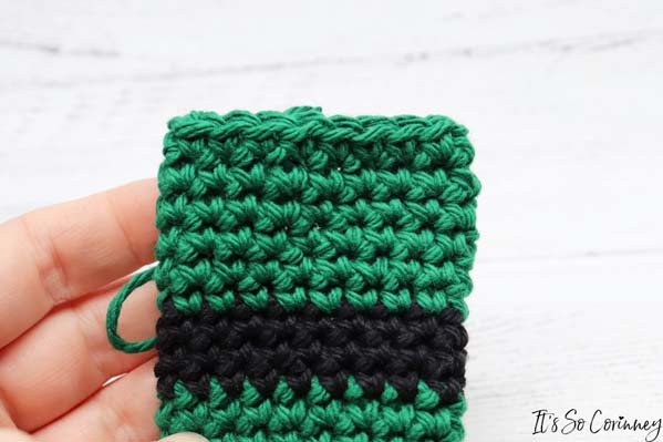 Next, move the joining seam to the back of the holder. Then take your yarn needle and a piece of green yarn and sew the bottom of the gift card holder (round 1) closed. Weave in the ends of your yarn.