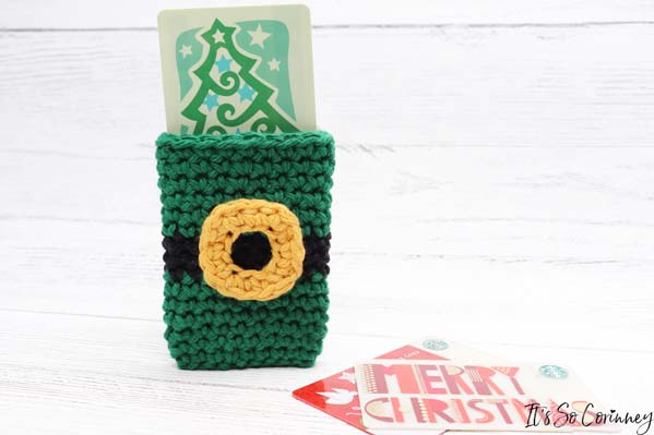 As I was looking online at different Christmas decorations it hit me (not literally)! I would make a super cute (and easy) elf belt gift card holder! I was super tickled with this idea and when I rummaged through my yarn stash I had every color that I needed (total score!). This quick to make crochet gift card holder is going to be super cute as a gift this Christmas holiday! Now, I just need to make a couple more so I can be prepared for the gift cards that I will be gifting!