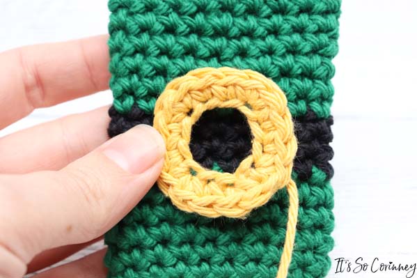 Center the belt buckle over the black belt strip. Using the long tail of the gold yarn sew the belt buckle to the gift card holder. Weave in yarn ends.
