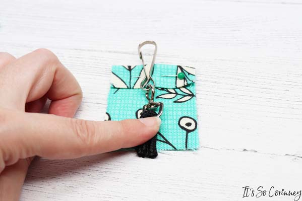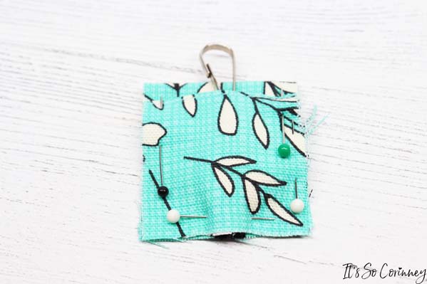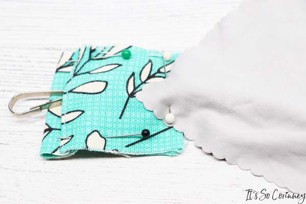 Then lay the Pattern B piece on top of the swivel clasp and the Pattern A piece. The raw bottom edges of both pieces should be at the bottom touching. Then pin around the eyeglass lens cloth cover making sure to catch all layers.
