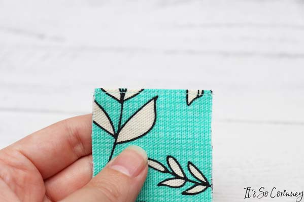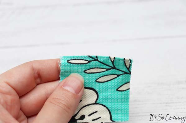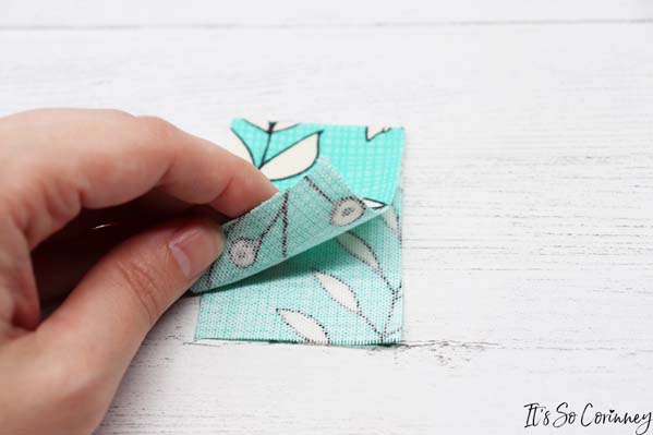 Next, cut your ribbon or cording 2 inches long and slide the swivel clasp on. Then put the raw edges of the cording in the middle of the bottom of the Pattern A piece. Make sure that you have the folded side of the Pattern A piece facing up like in the below picture.