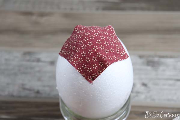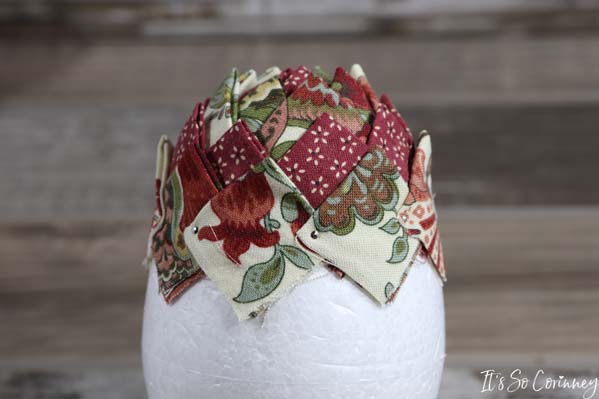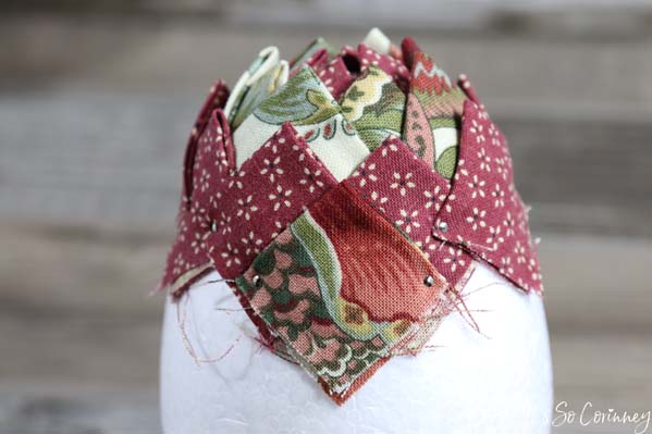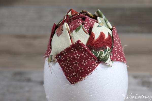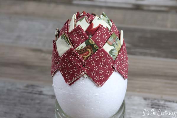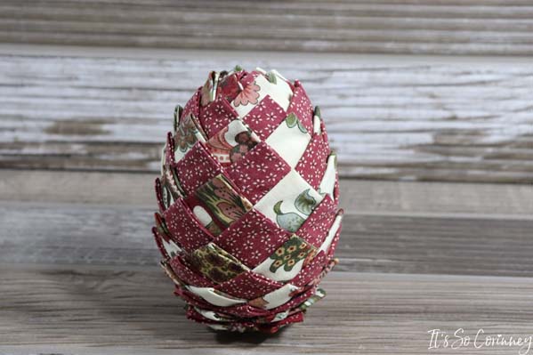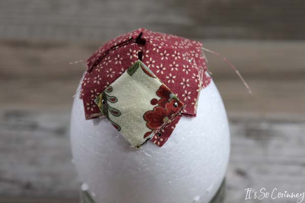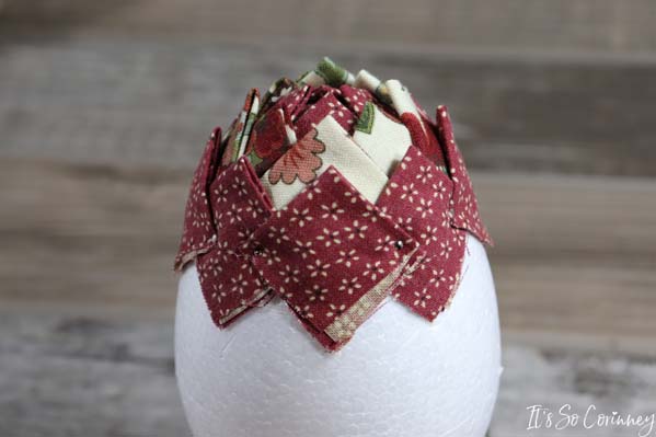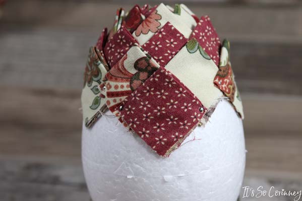 Add the next squares in each valley of the previous round’s squares. Continue this pattern for next rounds until you have covered the entire egg. Make sure to alternate the fabric colors for each round!