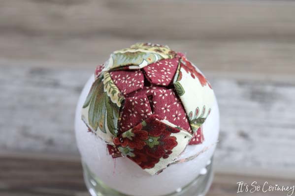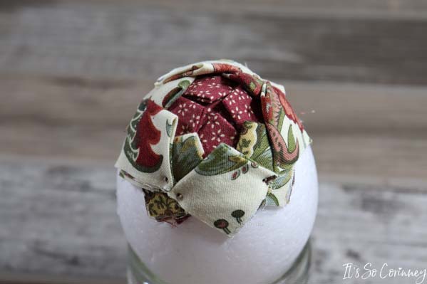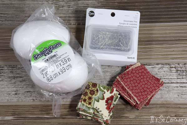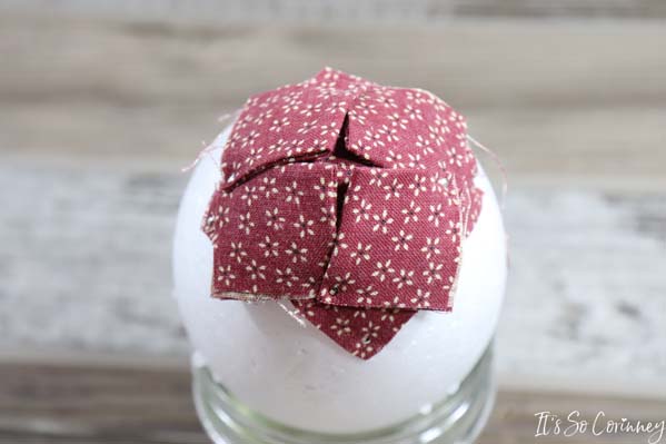 Now, I have made fabric ornaments in the past and have always thought it would be super cool to make a fabric pinecone. So, I found some foam eggs at Hobby Lobby and I started cutting squares! Pretty soon I had the cutest pinecone ever (at least in my opinion)! This easy no-sew fabric pinecone is the perfect iconic image to decorate your house during fall or add a ribbon and make it into a Christmas tree ornament.