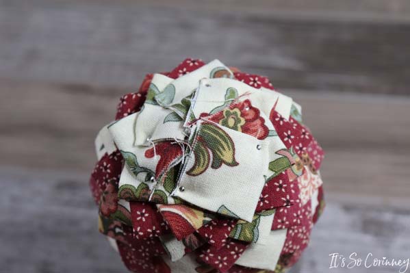 Next, take your decorative pins and pin each corner of the square. Make sure that you have covered all of the pins and raw edges of the last round. If you wanted to turn this into a Christmas tree ornament this is the stage that you could add some ribbon to it. All you need to do is cut 7 1/2 inches of your ribbon and attach to the pinecone using decorative pins. You can see how I did this for the Captain America ornament.