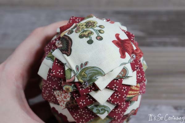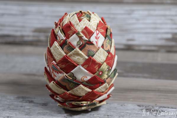 So…….as you can see the easy no-sew fabric pinecone is super versatile because it can be made in several colors. And you could decorate your house with the fabric pinecone for fall and when Christmas comes slap a ribbon on it and use it as an ornament (total win!).