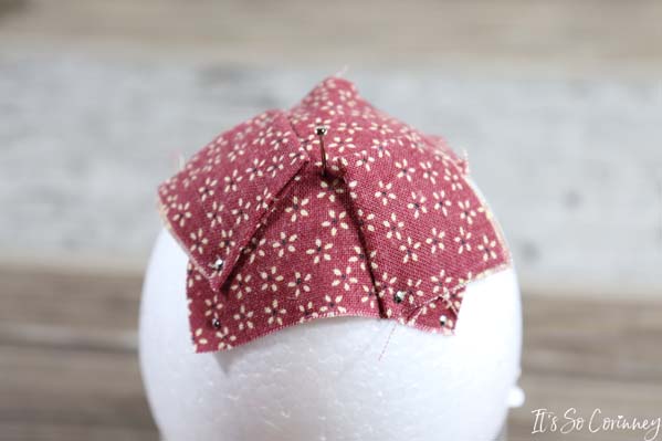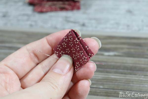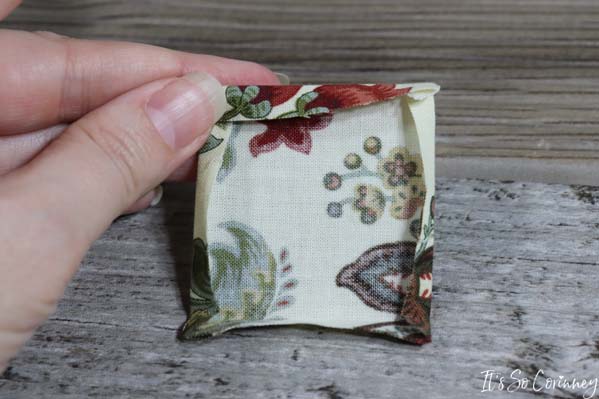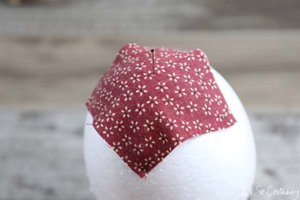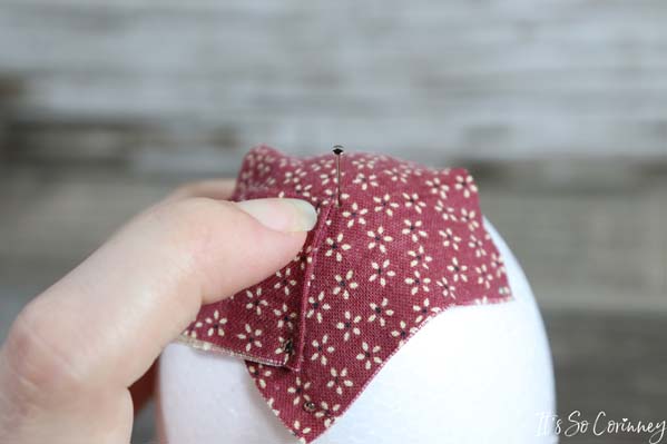 So, since the bottom of the pinecone isn’t quite pretty we are going to cover it. Take the square that you cut from Pattern B and press under all four edges of the square.