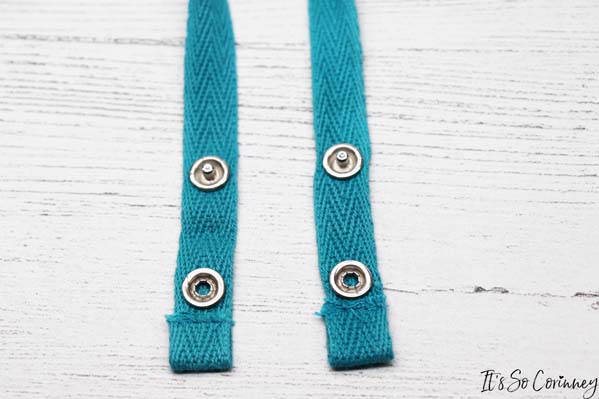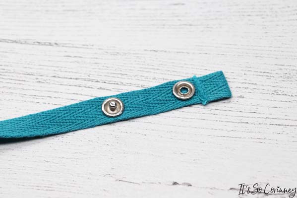 Next, add the snaps for the other side of the strap. Make sure that you have your snaps at the same measurements on both sides so they match (it bothers me if they don’t!).
