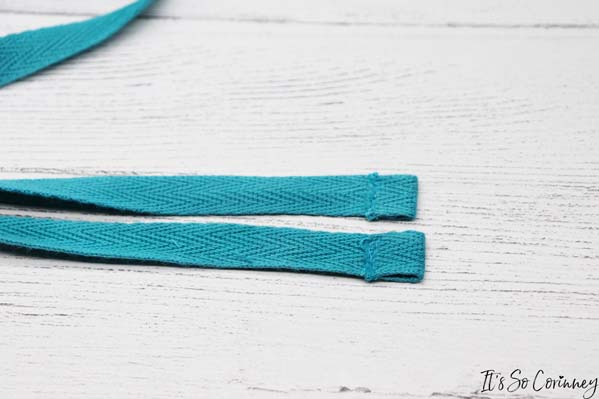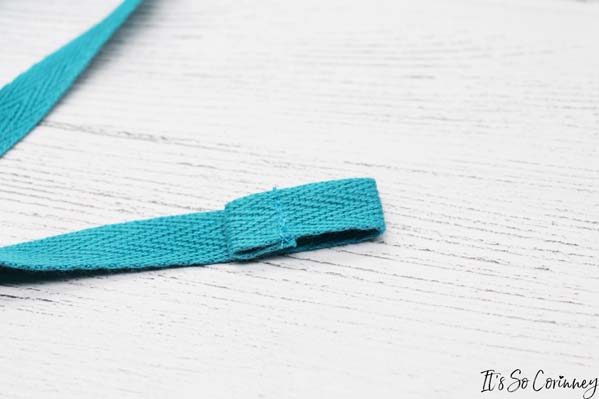 Next, fold over 1/2 inch of the twill tape and sew down. This will help keep the tape from fraying.