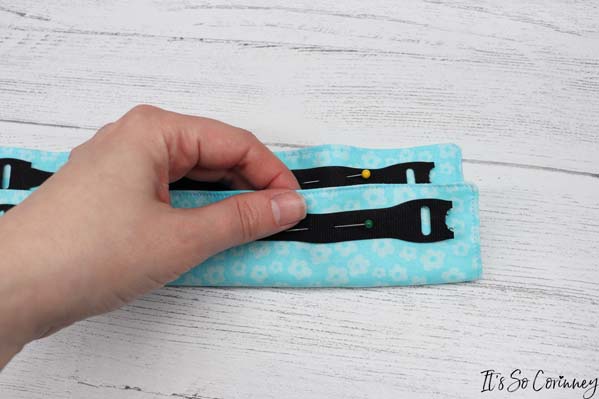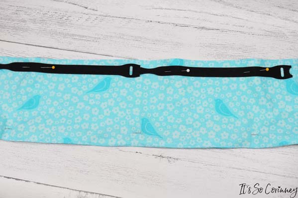Next, pin your Velcro 1/2 inch from the edge of the basket handle cover. As you can see I used the Velcro cord ties because it’s all I had on hand. You want your Velcro to run the entire length of the handle cover.