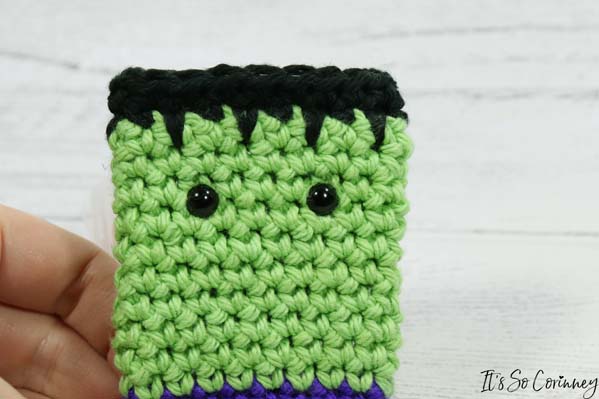 Then insert the 6mm safety eyes between rounds 10 and 11. I placed them with three stitches in between on the side of the holder that didn’t have the joining seam. Next, take some small jewelry cutters and cut the back of the safety eyes down. Make sure to not cut too far down or the back of the safety eye won’t stay on!
