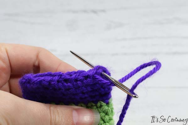 Next, take your yarn needle and a piece of purple yarn and sew the bottom of the gift card holder closed. Weave in the ends of your yarn.