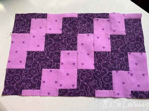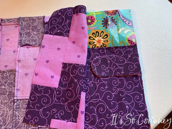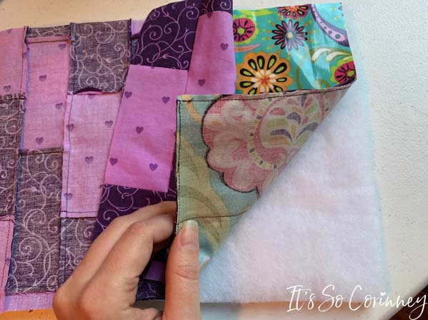 If you are using a solid piece of fabric for the outside then you can totally ignore this picture! I decided to make a mini quilt top and then cut it down to the proper size. If you would like to copy this design it’s 4 x 2 rectangles that I alternated in each row.