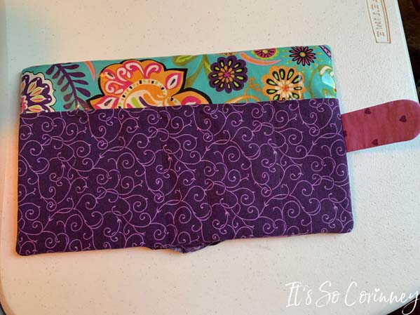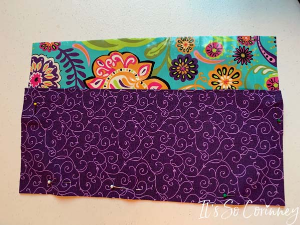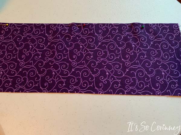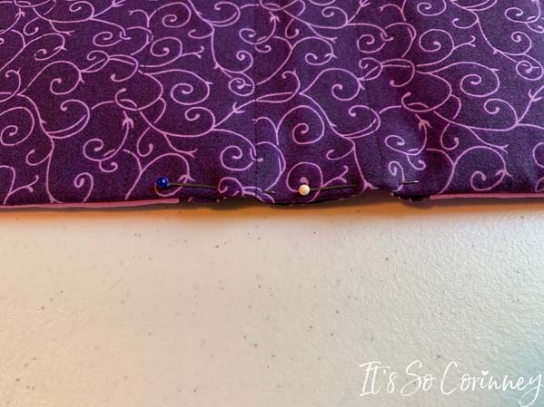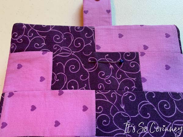 So, pull back your outside material from your sandwich on the right side of the case and center your tab. Make sure to pin tab down so it doesn’t shift during sewing!