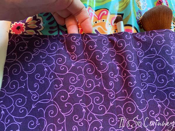 So, I came up with a plan to sew a makeup brush case! I LOVE my case because it’s so handy to keep your brushes protected and is easily packed for trips! On the inside where the brushes touch the fabric, I was lucky enough to find laminate cotton but you could totally use Pul material, which is what cloth diapers are made out of. Just make sure whatever material you use for the main inside piece that it’s a material that you can wipe down when makeup gets on it.