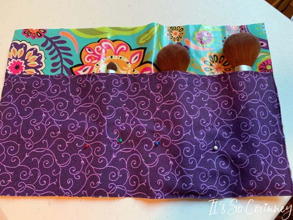 Now take out your makeup brushes and use them to measure how big the slots need to be. Remember that makeup brushes are round so if you sew the slots too narrow then you won’t be able to inset the brushes. Pin where the sewing lines need to be. For mine the slots from right to left measured 3, 2 3/4, 1 1/2, 1 1/2, and 4 1/2 inches.