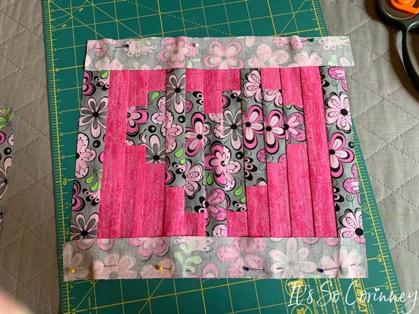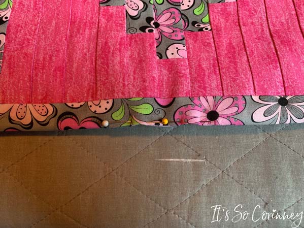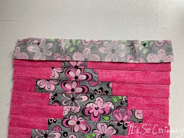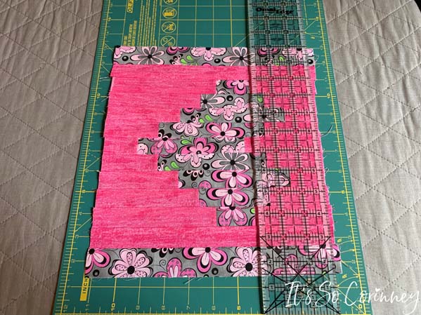 After pressing, pull out your cutting mat to block the quilt top. Remember how our pink strips where not even at top and bottom of the quilt? We are going to easily solve this problem by using your rotary and straight edge to even those up. You don’t need to cut off too much just enough to ensure that it’s straight and even.