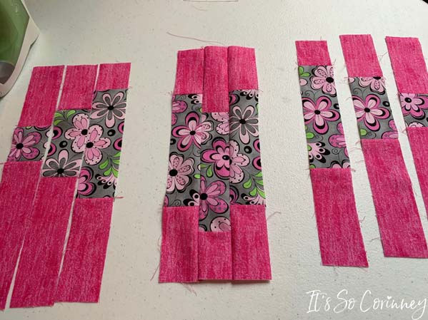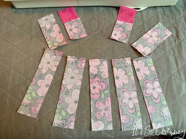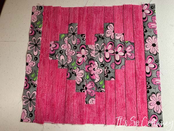 Then once finished sewing all of the bottom pink rectangles I cut the thread between each rectangle set and pressed. Next, I used the exact same technique to attach the top pink rectangles to the heart pieces.
