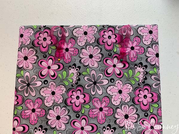 Then cut two pieces of your ribbon 4 inches long. Place them a couple of inches from the top of the quilt and hand sew. Make sure that your ribbons are evenly placed or when you hang your quilt it will hang crooked.