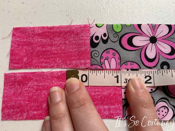 Now we get to assemble the quilt top! Take strip #1 and measure 1 inch from the bottom of the heart rectangle. This is where we want the heart rectangle for strip #2 to be sewn. Notice that the pink rectangle for strip #2 is slightly longer than strip #1. This is perfectly fine since we will block the ends after the quilt top is finished. With right sides together sew the two strips.