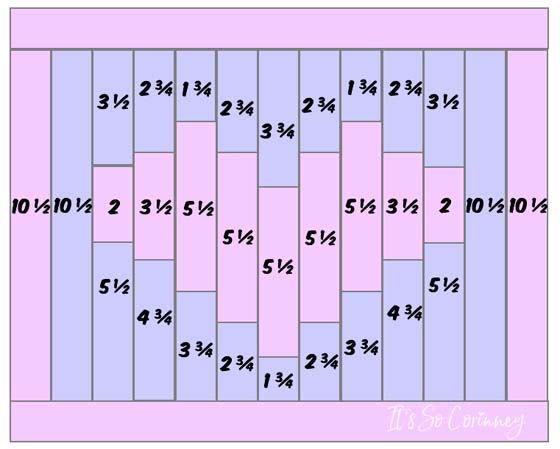After you have cut all of your rectangles lay them out on a table according to the diagram below the cutting list. I love doing this because I can see if I missed a piece and it makes it easier to figure out where each rectangle needs to be sewn.
