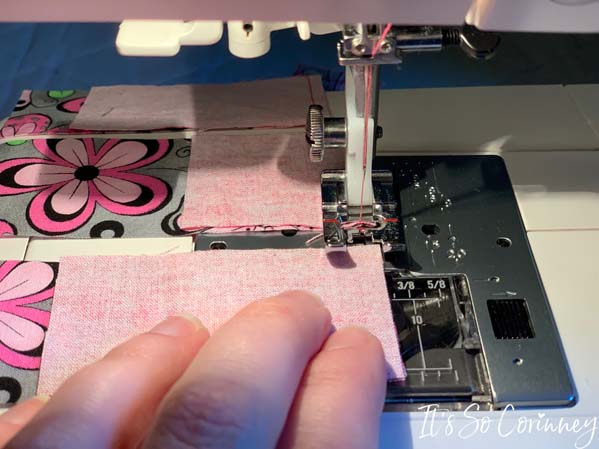 To make this project go faster, I used the continuous sewing method. This just means that I didn’t raise my foot and cut after each rectangle set. Instead I sewed the first set then without lifting my foot feed the next set under and sewed. Trust me this is a huge time saver with so many rectangles to sew.