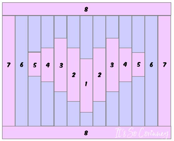 So, to make these instructions a little easier to understand I have numbered the strips of the quilt. Notice that the same size strips have the same exact number.
