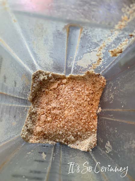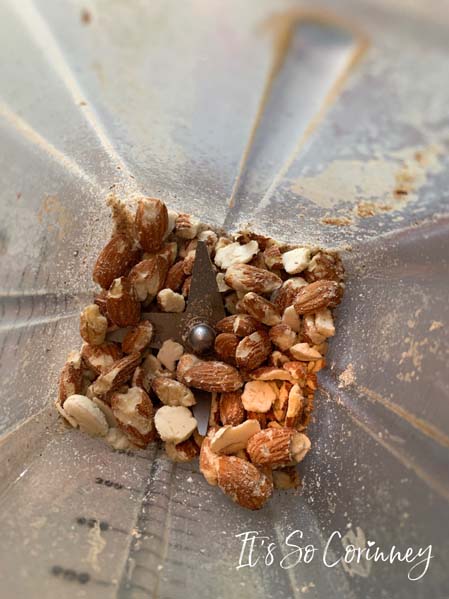 Blend 1 cup almonds until they are powered. Be careful not to blend for too long or the almonds will start to turn into almond butter!