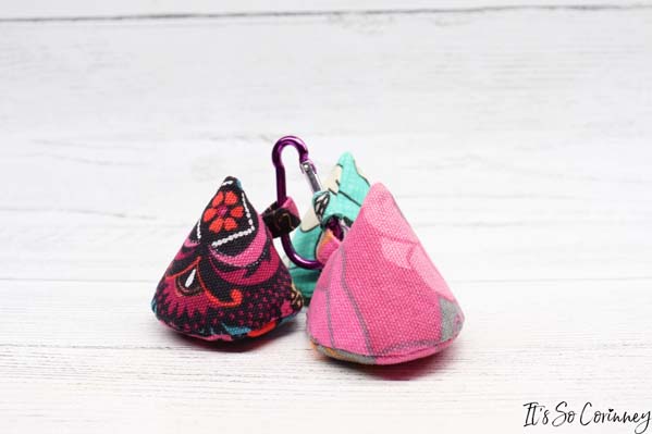 So, I love these little DIY pattern weights so much I made one in every color of canvas fabric I had on hand! And……. to keep them together I just slipped a mini carabiner hook through the tabs and now they will never be far away from each other!