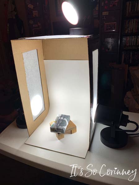 Have you ever had something that you wanted to take a picture of but just couldn’t find the right place to take it? You get so frustrated after searching all over the house and endlessly adjusting your photo settings just for the pictures to still look bad! You are not alone! So many times I try to take pictures but the lighting just isn’t right. Taking pictures outside makes it look better but you have to make sure the weather is perfect. The worse is when you really want or need to take a picture at night! Good thing there is a solution to this problem! A photo light box helps you get bright clean looking pictures during any time of the day! Now you could buy one of the many light boxes that are online but the cheapest I found was around $20 and that didn’t even include the lamps. So I dug through what I had on hand and made one of my own which cost me NOTHING (free is my favorite)! I did purchase the lamps and light bulbs, but I would have had to do that with the online one as well.