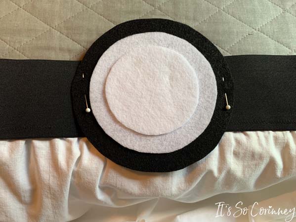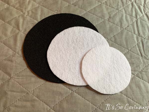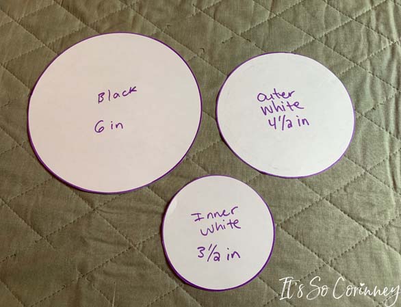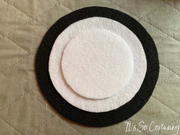 Then glue the 4 1/2 inch white circle to the center of the black one. While I used hot glue to attach the pieces I’m sure you could use fabric glue as well.